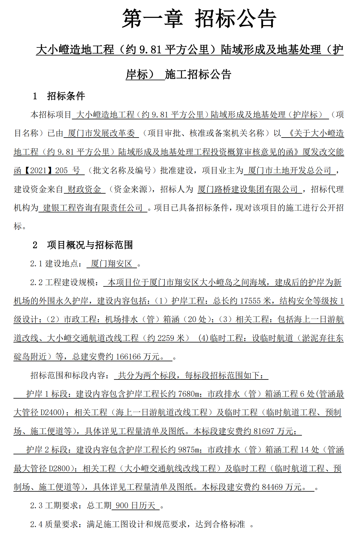 16億大項目!廈門大小嶝造地工程! 發布日期:2021年06月04日 瀏覽次數:3523 關鍵字: 公司 項目基本信息招標項目編號: E3500000717002736002招標人: 廈門路橋建設集團有限公司招標代理名稱: 建銀工程咨詢有限責任公司招標類型: 施工招標方式: 公開招標聯系電話: 13616032431