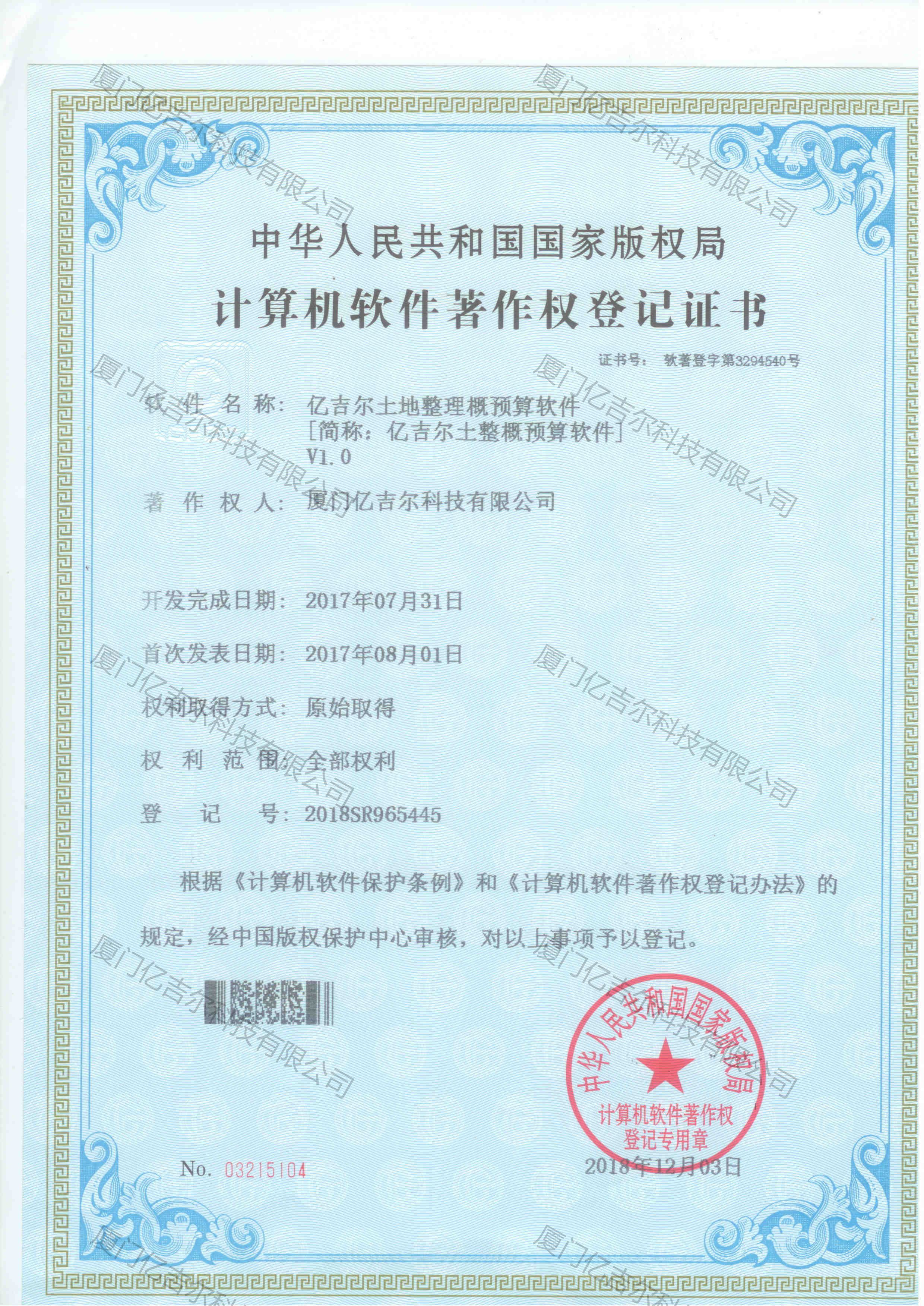 億吉爾土地整理概預(yù)算軟件著作權(quán)登記證書 發(fā)布日期:2018年12月03日 瀏覽次數(shù):3453 關(guān)鍵字: 公司 1/1億吉爾土地整理概預(yù)算軟件著作權(quán)登記證書