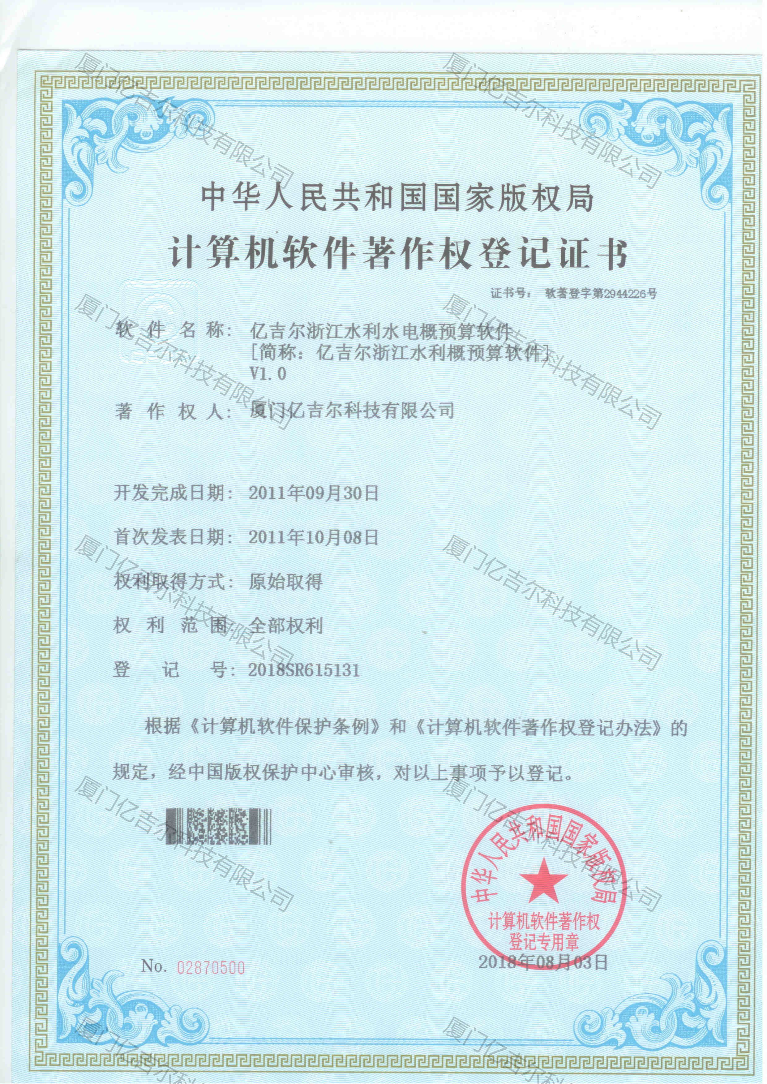 億吉爾浙江水利水電概預(yù)算軟件著作權(quán)登記證書 發(fā)布日期:2018年08月03日 瀏覽次數(shù):3026 關(guān)鍵字: 公司 1/1億吉爾浙江水利水電概預(yù)算軟件著作權(quán)登記證書